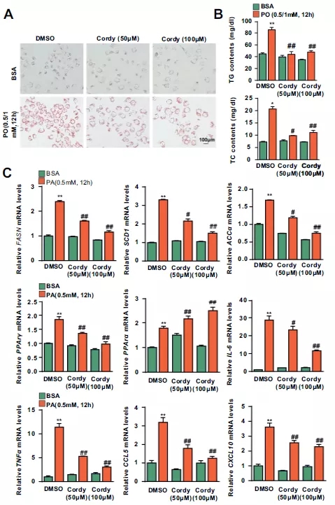图1. 虫草素对肝细胞脂质蓄积和炎症的影响。