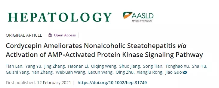 非酒精性脂肪肝炎(nonalcoholic steatohepatitis, NASH)是由营养过剩引起的肝脂肪变性和慢性炎症导致的肝脏代谢性疾病,会逐步发展为肝纤维化、肝硬化甚至肝细胞癌,目前尚未有批准用于NASH治疗的药物。近来,有研究发现,通过激活AMPK通路,虫草素能抑制肝脏脂肪堆积,防止肝脏炎症损伤和纤维化的发生。该研究成果于2021年2月发表在Hepatology (IF=14.679,Q1) 杂志上。