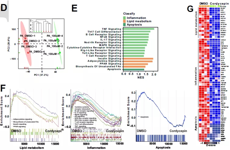 为研究虫草素对代谢应激下肝细胞脂质堆积和炎症的影响,通过混合脂肪酸PO(棕榈酸,PA和油酸,OA)刺激LO2细胞。结果表明虫草素有效降低了细胞内的脂滴蓄积、甘油三酯(TG)和血清总胆固醇 (TC)含量、脂肪酸合成(FASN、SCD1、ACCα、PPARγ)和炎症(IL-6、TNFα、CCL5、CXCL10)相关基因的表达。为系统地评价虫草素对肝细胞的影响,进行了肝细胞RNA-Seq分析,结果表明组间的差异基因显著富集于炎症、脂代谢和凋亡相关通路,而且虫草素能够显著下调富集在上述通路的差异基因的表达。