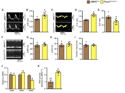 首先,研究者们培育了心脏特异性FoxO1缺陷型小鼠(Foxo1 Cardiac−/−),并且建立了实验性的T2D模型。多普勒超声心动图结果显示:Foxo1 Cardiac−/−小鼠的心脏舒张功能相比野生型对照得到了显著改善,心肌PDH活性也明显增加。与此同时,作者并没有观察到心脏收缩能力方面的差异: Foxo1 Cardiac-/-小鼠的LVEF,LVFS和心输出量与野生型对照保持相似水平。
