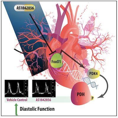 大量研究与临床实践表明,II型糖尿病(T2D)会导致糖尿病性心肌病的风险上升,该疾病的特点是心脏舒张功能障碍。研究发现,FoxO1因子的活性在T2D中得到增强,并上调了丙酮酸脱氢酶(PDH)激酶4(PDK4)的表达,从而抑制了PDH的活性。PDH的正常激活对于葡萄糖氧化反应具有关键作用,而葡萄糖氧化水平过低则会导致心脏效率低下。对此,一个合理的假设是FoxO1的活性抑制可导致PDH活性增强,从而减轻糖尿病性心肌病的严重程度。