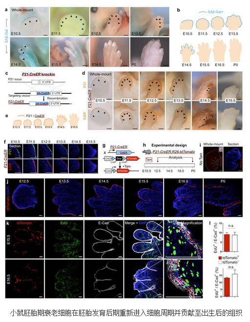 6月5日,国际学术期刊 Cell Research 在线发表了中国科学院生物化学与细胞生物学研究所周斌组的最新研究进展 Embryonic senescent cells re-enter cell cycle and contribute to tissues after birth。此研究揭示了小鼠胚胎发育过程中衰老细胞(senescent cell)的命运,衰老细胞不会被全部清除,其中一部分可以保留到出生后,并且部分细胞会重新进入细胞周期,进行增殖。该研究拓宽了人们对细胞衰老的认识,暗示了胚胎发育过程中,细胞衰老可能是一个暂时的细胞状态,并且具有可逆性。细胞衰老是指随着时间的推移或面临外界应激压力时,细胞增殖能力减弱,脱离细胞周期,该过程与机体衰老 (aging)、多种疾病(如肿瘤,动脉粥样硬化等)以及组织的损伤后修复等过程具有重要的联系。近期研究发现,小鼠正常胚胎发育过程中中肾管、内耳淋巴囊、神经管和四肢顶外胚层嵴等处有细胞衰老的出现,并且揭示了胚胎发育过程中细胞衰老对组织器官的结构形成起到一定作用。而且研究中指出,在胚胎发育后期,衰老的细胞都会被清除。然而这些研究都是基于 P21 的表达和 SAβ-Gal 的染色,并不能说明衰老细胞的真实命运。该研究中,研究人员首先通过 P21 和 SAβ-Gal 的染色确认它们在四肢顶外胚层嵴处从 E15.5 天开始消失。为了揭示胚胎期衰老细胞的命运,研究人员在周斌的指导下,利用胚胎时期细胞衰老的分子标志 P21,构建了 P21-CreER 及 P21-tdTomato 小鼠,发现标记的细胞在 E11.5 和 E12.5 天不会增殖,而且会表达衰老细胞的 marker,P21、CD44 和 HP1γ。另外,通过 FACS 分选 E12.5 天被标记的细胞,发现这些细胞都会呈现 SAβ-Gal 的活性。证明了工具小鼠可以在体内标记胚胎时期的衰老细胞,并且可运用 P21-CreER 小鼠研究衰老细胞的命运。随后,研究人员利用 P21-CreER;R26-tdTomato 小鼠对胚胎时期的衰老细胞进行谱系示踪研究,发现四肢顶外胚层嵴处的衰老细胞在 E15.5 和 E16.5 天并不会完全被清除,而是一直能存活到出生后,只是不再表达 P21,也没有了 SAβ-Gal 的活性。通过 EdU 和 Ki67 染色发现,示踪的衰老细胞在胚胎发育后期会进入细胞周期,重新增殖。其他衰老的组织器官处的衰老细胞也存在同样的现象。这一发现首次在体内揭示了衰老细胞的命运,并且暗示了胚胎发育过程中,细胞衰老是一个暂时的细胞状态,而且具有可逆性,也为治疗细胞衰老引起的疾病提供了一个新的思路。该研究工作得到暨南大学教授鞠振宇、香港中文大学教授 Kathy Lui 等的大力支持,得到中科院、国家基金委、国家科技部及上海市科委资助。
