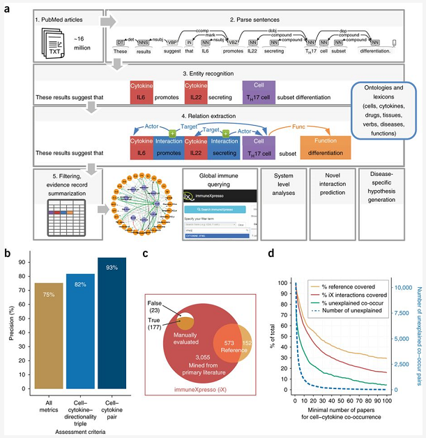 ▲immunXpresso 的工作原理示意图(图片来源:《Nature Biotechnology》)这款人工智能数据引擎名为 immunXpresso,通过文本挖掘的方式,来构建免疫细胞间的通讯框架。研究人员将 immunXpresso 应用于文献服务检索系统 PubMed 中,来识别 340 种细胞和 140 种细胞因子在数千种疾病中的相互关系,从而发现细胞之间的互动状况及涉及到的细胞相关功能。通过扩大研究范围,研究人员得以对之前从未发现过的细胞和细胞因子之间的相互作用进行预测,并用实验来进行验证。同时,研究人员还表示,当免疫系统的相关理论与丰富的数据源及人工智能结合之后,就可以产生能够战胜疾病的新发现。