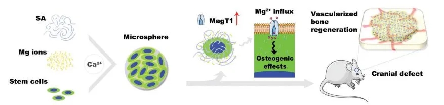 近年来,生物材料策略在修复大型骨缺损方面受到格外关注。以前的研究报告称,生物材料的结构和组成尽可能地模拟天然骨组织,可显著提高骨再生效率,例如将天然存在于骨基质内的生物活性离子,如铜离子、锶离子和镁离子(Mg2+)加入骨替代物中,可刺激血管化骨再生,然而有关这些生物活性离子的刺激效应的具体机制尚未完全了解。