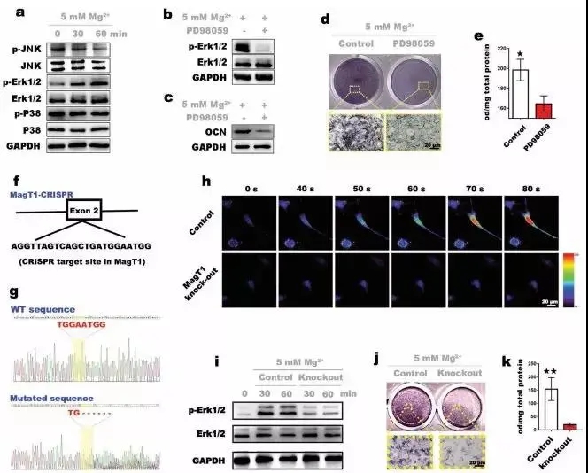 随后讨论Mg2+成骨诱导作用的分子机制。先将BMSCs培养于富含5×10−3 M Mg2+的培养基中,在不同时间点收样进行Western Blot。结果表明Mg2+通过选择性地激活MAPK/ERK通路诱导干细胞成骨分化,并且诱导成骨作用与MagT1介导的Mg2+流入密切相关。