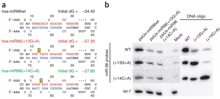 (a)野生型和突变型的miR96前体(Pre-miR96)二级结构分析。突变型miR96前体的二级结构分别在第13或第14个碱基处有突起,且miR96前体二级结构自由能上升(野生型Initial dG=-34.40,突变型Initial dG=-27.30或-27.80)。预测结果表明突变型miR96前体二级结构的稳定性降低。(b)RNA Blot检测miR96成熟体的表达量。将野生型和突变型的miR96前体装载进psiUx plasmid,并转染HeLa cells表达miR96成熟体,通过设计特异性探针检测其表达量。发现转野生型miR96前体的HeLa cells的miR96成熟体表达量最高。表明突变型miR96前体二级结构的稳定性降低会影响miR96成熟体的表达量。