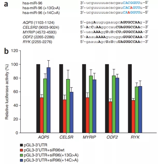 (a)野生型和突变型miR96与靶基因mRNA的配对情况。(b)荧光素酶报告实验验证miR96点突变降低其对靶基因的识别能力。五个靶基因3’UTR靶区域序列装载进pGL3载体中,通过共转染野生型和突变型siR96计算荧光素酶活性。结果表明miR96点突变降低其对靶基因的识别能力。