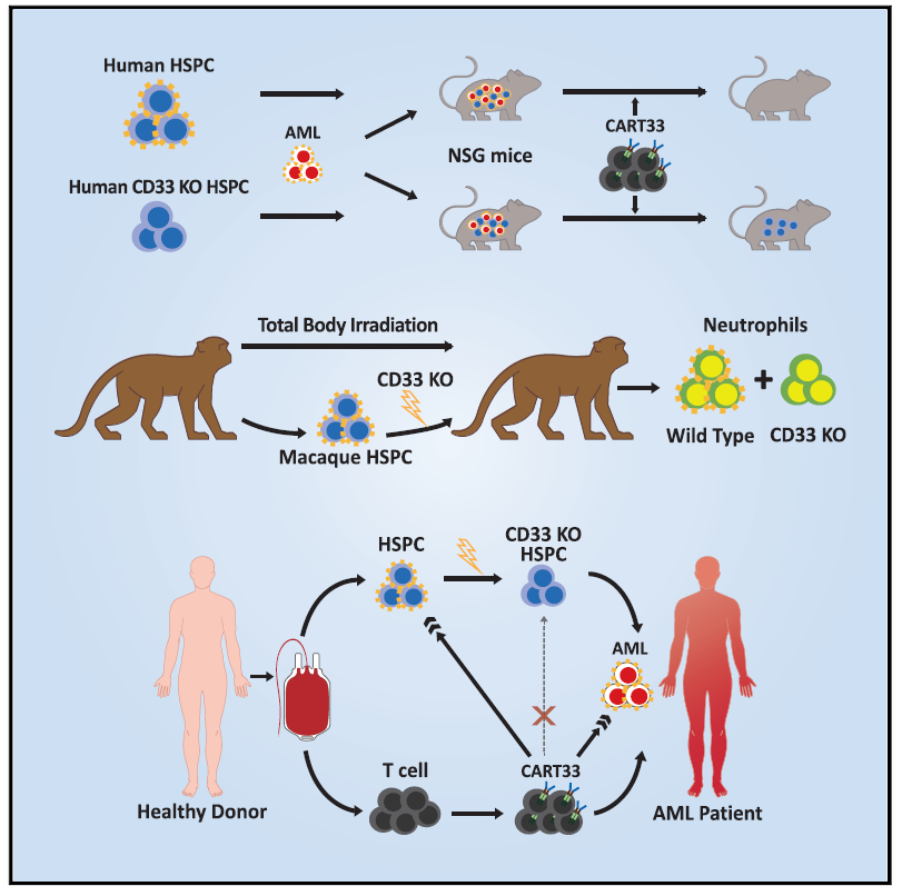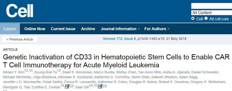 图片来源:Cell(DOI: https://doi.org/10.1016/j.cell.2018.05.013)5月31日,发表在Cell杂志上题为“Genetic Inactivation of CD33 in Hematopoietic Stem Cells to Enable CAR T Cell Immunotherapy for Acute Myeloid Leukemia”的这项研究中,宾夕法尼亚大学医学院的Saar Gill博士以及美国国立卫生研究院的 Cynthia E. Dunbar博士带领的团队首创了一种用CAR-T细胞治疗急性髓系白血病(Acute Myeloid Leukemia,AML)的新方法。AML是第二常见的白血病类型,许多病人将接受骨髓移植。几年前,为了治疗急性淋巴细胞白血病(acute lymphoblastic leukemia,ALL),Carl H. June教授等开发出了一种靶向CD19的CAR-T疗法,并在去年获得了FDA的批准。然而,CD19并不是AML的有效靶点,因为这类癌细胞并不表达该分子。因此,科学家们一直在寻找其他适用于AML的潜在靶点。