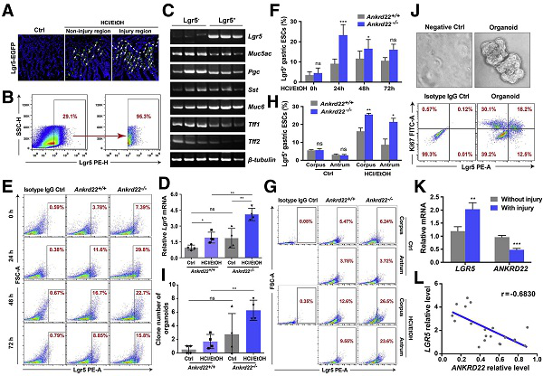 图1. ANKRD22缺失导致Lgr5+胃上皮祖细胞快速增殖