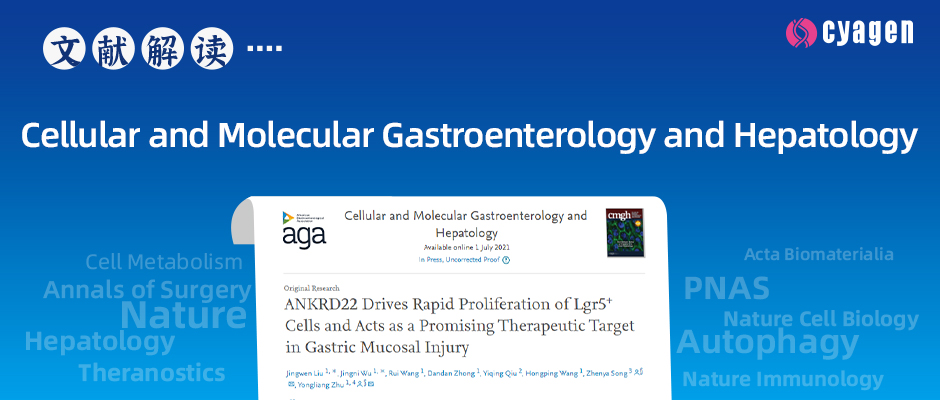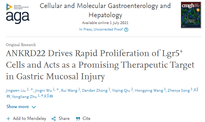 Liu J, Wu J, Wang R, Zhong D, Qiu Y, Wang H, Song Z, Zhu Y. ANKRD22 drives rapid proliferation of Lgr5+ cells and acts as a promising therapeutic target in gastric mucosal injury. Cellular and Molecular Gastroenterology and Hepatology (2021), doi: https://doi.org/10.1016/j.jcmgh.2021.06.020.
