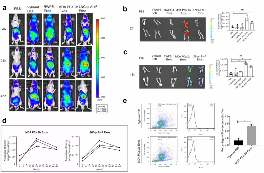 为了研究PCa外泌体的靶向性,研究人员将用Vybrant DID荧光标记的外泌体通过尾静脉注射入BALB/c裸鼠中,并检测荧光信号。结果表明裸鼠体内荧光信号仅在PCa-Exos组(MDA PCa 2b Exos组和LNCap AI+F Exos组)的骨骼中观察到,而在RWPE-1 Exos(正常前列腺细胞外泌体)组中观察不到,因为RWPE-1 Exos没有定位到骨骼,表明该骨靶点是PCa特异性的(图1a)。