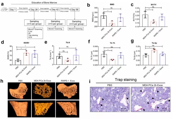为了测试PCa衍生的外泌体是否影响体内骨形成和骨溶解,研究人员将雄性BALB/c裸鼠通过尾静脉注射PBS(对照组)、PCa外泌体或正常外泌体,然后采集胫骨进行形态学检查及x线扫描。micro-CT分析结果显示,MDA PCa 2b Exos组右胫骨的四个测量参数BMD、BV/TV、Tb.N和Tb.Th明显低于对照组,而MDA PCa 2b Exos组骨干的BS/BV和Tb.Sp显著升高(图2)。这些结果表明,通过尾静脉进行MDA PCa 2b外显体培养4周后,骨发生骨溶解。