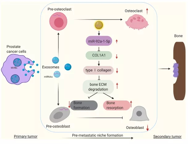 该研究发现前列腺癌(PCa)细胞外泌体通过以骨为靶点,在体内被骨基质细胞内化、诱导骨溶解、加速骨肿瘤生长,是调节骨稳态的关键介质。在作用机制上,由PCa外泌体递送的microRNAs (miRNAs)中,miR-92a-1-5p是其中最丰富的miRNA,它通过直接靶向COL1A1下调I型胶原蛋白的表达,从而促进破骨细胞的分化和抑制成骨细胞的形成,为PCa骨转移提供了潜在的治疗靶点。