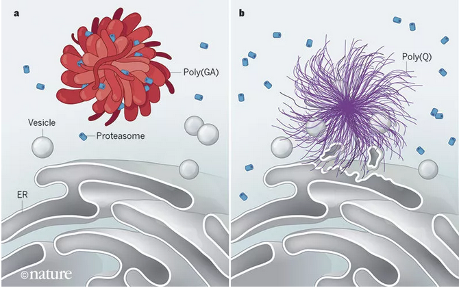 图 1 聚集毒性产生机制的对比。a, 与一大类 ALS 相关的 poly-GA 在神经元中形成聚集。作者 5 通过细胞内高分辨率结构,展示了与蛋白酶体(图中为蓝色)结合的由 poly-GA 形成的带状聚集(图中为红色)。蛋白酶体参与其他蛋白质的降解过程,它被 poly-GA 聚集捕获并处于功能停滞状态,从而导致细胞毒性。Poly-GA 聚集不与囊泡和内质网等具膜细胞器结合。b, 但与亨廷顿病相关的 poly- Q 聚集呈纤维状(图中为紫色)7,这些聚集使囊泡膜和内质网膜产生形变。这些结果表明不同的聚集可以通过不同的机制引起神经退行性改变。蛋白酶体由桶状的核心亚基(蛋白质底物的切割降解在此发生)和一个或两个调节亚基组成,这些调节亚基覆盖在桶的末端,形成其盖子,对试图进入蛋白酶体内部的分子进行限制,保证只有携带泛素标记的蛋白才能进入。在既有研究中,研究者曾观察到调节颗粒的多种构象 9,10,表明蛋白酶体会在基态、准备态和底物结合态之间发生循环性的构象变化。作者使用计算方法对蛋白酶体图像进行平均,从而判断图像中蛋白酶体的状态(相关技术参考文献 11)11,发现在 poly-GA 聚集内同时存在基态和底物结合态的蛋白酶体。他们还发现,与不含 poly-GA 产物的对照组神经元相比,表达 poly-GA 的神经元中具有两个调节亚基的蛋白酶体的比例大幅增加。聚集中接近四分之一的蛋白酶体都与一种近期解析的蛋白酶体构象9 一致,在这种构象下,蛋白酶体与底物结合,但底物被困于蛋白酶体核心亚基中,使蛋白酶体的功能处于阻滞状态。而在那些与 poly-GA 纽带最为接近的蛋白酶体中,处于阻滞状态的蛋白酶体比例更高,达到 36%。为什么会发生这种阻滞?在重建的断层图像中,作者在 poly-GA 纽带和蛋白质 RAD23 与蛋白酶体的结合位点之间发现了许多有电子密度分布的区域。 RAD23 参与将泛素标记的蛋白底物募集到蛋白酶体的过程,并且会在 poly-GA 聚集中富集 8。由此推断,这些电子密度可能代表着与聚集内 RAD23 结合的泛素化标记的蛋白底物。研究者尚不清楚“噎住”蛋白酶体的究竟是哪些蛋白,但 poly-GA 片段本身很可能就是其中之一,并通过这种途径直接导致了蛋白酶体活性的降低。不管具体机制如何,细胞内蛋白酶体活性的降低都会对蛋白质降解途径有害,并由此导致细胞毒性。这些结果又引出了几个需要回答的重要问题。首先,由 C9orf72 扩增诱发的 ALS 被认为与 poly-GA 聚集形成以及 C9orf72 蛋白产物的减少都有关系,但这两种机制所造成的影响各有多大?C9orf72 蛋白参与形成细胞自噬相关的复合物 12。细胞自噬是细胞内蛋白质等组分被降解和循环利用的过程。因此,C9orf72 蛋白水平的降低可能与 poly-GA 依赖的蛋白酶体抑制共同增加了神经元毒性。其次,poly-GA 聚集对其他蛋白质的捕获是否也会增加细胞毒性?在 poly-GA 聚集中富集的自噬相关蛋白 p62 就是进一步的研究对象之一 8。第三,与聚集解聚相关的几种分子机器都没有在 poly-GA 结构中富集,其原因尚不清楚。最后,poly-GA 是由 C9orf72 扩增产生的表达量最高的重复序列蛋白,但不是唯一一种——突变也可以产生甘氨酸 - 精氨酸(poly-GR)和脯氨酸 - 精氨酸(poly-PR)聚集。这些其他聚集的结构与 poly-GA 相比如何?大多数关于 poly-GR 和 poly-PR 聚集的既有数据认为它们不会缠结蛋白酶体,这意味着它们通过其他机制产生毒性 13,14。进一步的 3D cryo-ET 研究,以及对于 C9orf72 插入突变序列的天然翻译产物,而非本研究中使用的构建蛋白产物进行深入分析,可能会澄清患者体内聚集与研究中使用的模型聚集之间的异同。概括而言,此项工作以前所未有的分辨率,使用 3D cryo-ET 实现了对细胞内基本进程的可视化观测 11。此外,它为理解聚集相关神经退行性疾病的复杂机制奠定了新的基础。参考资料1. DeJesus-Hernandez, M. et al. Neuron 72, 245–256 (2011).2. Taylor, J. P., Brown, R. H. Jr & Cleveland, D. W. Nature 539, 197–206 (2016).3. Yamakawa, M. et al. Hum. Mol. Genet. 24, 1630–1645 (2015).4. Zhang, Y.-J. et al. Acta Neuropathol. 128, 505–524 (2014).5. Guo, Q. et al. Cell 172, 696–705 (2018).6. Beck, M. & Baumeister, W. Trends Cell Biol. 26, 825–837 (2016).7. Chang, Y.-J., Jeng, U.-S., Chiang, Y.-L., Hwang, I.-S. & Chen, Y.-R. J. Biol. Chem. 291, 4903–4911 (2016).8. Bauerlein, F. J. B. et al. Cell 171, 179–187 (2017).9. Wehmer, M. et al. Proc. Natl Acad. Sci. USA 114, 1305–1310 (2017).10. Chen, S. et al. Proc. Natl Acad. Sci. USA 113, 12991–12996 (2016).11. Amick, J. & Ferguson, S. M. Traffic 18, 267–276 (2017).12. May, S. et al. Acta Neuropathol. 128, 485–503 (2014).13. Lin, Y. et al. Cell 167, 789–802 (2016).14. Lee, K.-H. et al. Cell 167, 774–788 (2016).文章来源:https://www.nature.com/articles/d41586-018-03000-2