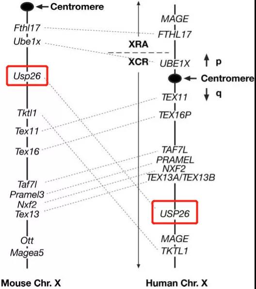 图1. USP26基因在小鼠和人类X染色体上的位置(红框)[1]