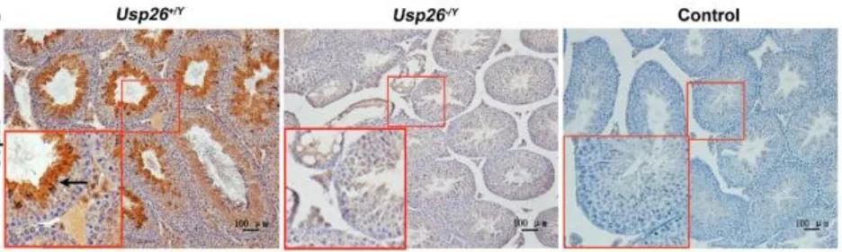 图3. IHC染色分析USP26蛋白在Usp26+/Y小鼠和 Usp26-/Y小鼠睾丸中的表达和分布[4]