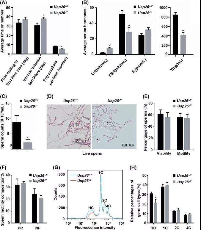 图4. Usp26缺失导致雄性小鼠不育[4]。A) Usp26+/Y和Usp26−/Y小鼠体内的生殖能力。n = 11 and 15; *P < 0.05. B) ELISA测定Usp26+/Y和Usp26−/Y小鼠性激素水平。(每组n = 10). LH, luteinizing hormone(促黄体激素); FSH, follicle-stimulating hormone(促卵泡激素); E2, estradiol(雌二醇); T, testosterone(睾酮). *P < 0.05, **P < 0.001. C-F)精液分析结果。所有值用平均值±SD表示(n = 10)。采用单因素方差分析(one-way ANOVA)和Tukey的多重比较检验确定统计学差异。C)计算机辅助精子分析(CASA)的Usp26+/Y和Usp26−/Y小鼠精子计数。D) 0.5%伊红染色计数活精子。♦: 活精子; ☆:死精子。E) CASA检测Usp26+/Y和Usp26- /Y小鼠的精子活力和活力。F) CASA计数Usp26+/Y和Usp26-/Y小鼠进行性和非进行性精子百分比。G) Usp26+/Y和Usp26-/Y小鼠睾丸的流式细胞术分析(每种基因型n = 10): G)睾丸细胞代表性DNA含量分布直方图。流式细胞仪直方图显示Usp26 -/Y和Usp26+/Y小鼠有4个主要峰:HC峰(成熟单倍体细胞或细长精子细胞)、1C峰(未成熟单倍体细胞或圆形精子细胞)、2C峰(精原细胞和次级精母细胞)和4C峰(初级精母细胞);蓝线:野生型小鼠;红线:纯合小鼠。H) Usp26-/Y和Usp26+/Y小鼠睾丸亚单倍体(HC)、单倍体(1C)、二倍体(2C)和四倍体(4C)细胞的相对百分比,*P<0.05。