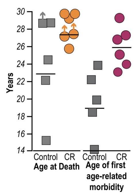 不过 Weindruch 教授和 Anderson 的这项研究成果在 3 年后,遭到了美国国立研究院老年研究所 Julie Mattison 研究团队的质疑。因为他们几乎也在同时期开展了类似的研究,但是没有观察到延长猕猴寿命的结果。甚至他们发现热量限制对癌症、糖尿病和心脑血管疾病的发生率也没有显著的影响,不过热量限制组的发病时间确实是要晚一些。他们这一研究成果于 2012 年刊登在《自然》杂志上 [5]。Mattison 研究让人们开始质疑限制热量的效果。不过,Anderson 的团队紧接着在 2014 年[6] 和 2017 年 [7] 连续在《自然通讯》发表两篇论文。再确认热量限制确实有利于猕猴的健康,以及提高猕猴的存活率。近日,法国研究团队在灵长类动物鼠狐猴身上展开的研究发现,30% 热量限制的饮食可以将鼠狐猴的寿命延长 50%,与衰老相关的疾病发病率也降低 [8]。