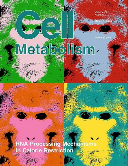 《细胞代谢》封面Anderson 在文末表示,由于猕猴与人类的高度相似性,热量限制对人肝脏 RNA 加工的影响,有可能在人类衰老和衰老相关疾病发生过程中起到关键作用。至于热量限制对肝脏 RNA 加工的影响是如何发生的?以及在其他的器官中是否也有类似的现象,还需要进一步的研究。不过有了这次的实验数据,后面的研究就有目的性多了。参考资料:[1]. Leanne M. Redman, et al. Metabolic Slowing and Reduced Oxidative Damage with Sustained Caloric Restriction Support the Rate of Living and Oxidative Damage Theories of Aging[J]. Cell Metabolism, 2018, 27, 1–11.[2]. Zimin A V, Cornish A, Maudhoo M D, et al. A new rhesus macaque assembly and annotation for next-generation sequencing analyses[J]. Biology Direct, 2014, 9(1): 20-20.[3]. Colman R J, Anderson R M. Nonhuman Primate Calorie Restriction[J]. Antioxidants & Redox Signaling, 2011, 14(2): 229-239.[4]. Colman R J, Anderson R M, Johnson S C, et al. Caloric restriction delays disease onset and mortality in rhesus monkeys[J]. Science, 2009, 325(5937): 201-204.[5]. Mattison J A, Roth G S, Beasley T M, et al. Impact of caloric restriction on health and survival in rhesus monkeys from the NIA study[J]. Nature, 2012, 489(7415): 318-321.[6]. Colman R J, Beasley T M, Kemnitz J W, et al. Caloric restriction reduces age-related and all-cause mortality in rhesus monkeys[J]. Nature Communications, 2014: 3557-3557.[7]. Mattison J A, Colman R J, Beasley T M, et al. Caloric restriction improves health and survival of rhesus monkeys[J]. Nature communications, 2017, 8: 14063.[8]. Fabien Pifferi, et al. Caloric restriction increases lifespan but affects brain integrity in grey mouse lemur primates[J]. Communications Biology, 2018: 1-8.[9]. McCay C M, Crowell M F, Maynard L A. The effect of retarded growth upon the length of life span and upon the ultimate body size one figure[J]. The journal of Nutrition, 1935, 10(1): 63-79.[10]. Heilbronn LK, de Jonge L, et al. Effect of 6-month calorie restriction on biomarkers of longevity, metabolic adaptation, and oxidative stress in overweight individuals: a randomized controlled trial. Jama. 2006;295(13):1539-48.[11]. Rhoads T W, Burhans M S, Chen V B, et al. Caloric Restriction Engages Hepatic RNA Processing Mechanisms in Rhesus Monkeys[J]. Cell metabolism, 2018, 27(3): 677-688. e5.