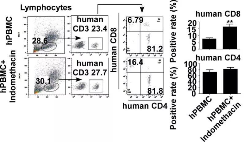图5. 吲哚美辛促进人CD8+ T细胞增殖。采取小鼠血液并去除红细胞后进行抗体标记染色,使用流式细胞仪检测人CD3, CD8和CD4阳性率。**;P < 0.01。
