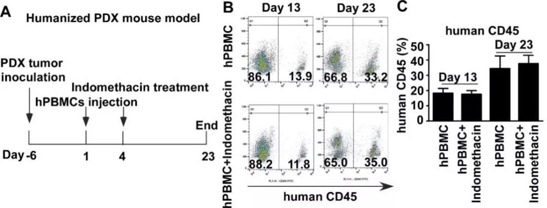 该模型使用了赛业生物公司提供的BRGSF小鼠,该小鼠是一种重度免疫缺陷小鼠,被广泛应用于肿瘤学(比如肿瘤生长、转移、抗肿瘤药物筛选)、免疫学(比如免疫细胞发于增殖机制、免疫疾病发生机理)等研究领域。使用该小鼠构建的人源化免疫系统重建模型窗口期长、且未观察到明显的贫血现象或小鼠体重下降等现象。注射PBMC后的第23天人CD45阳性率达到30%以上。本研究结果发现,吲哚美辛能够抑制TGFβ/SMA2/SMAD3信号通路,从而促进肿瘤微环境中CD8+ T细胞的免疫应答。