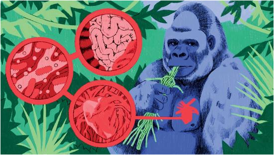 图注:插画展示了一只银背大猩猩在吃绿茎植物,在大猩猩左胸处有个红色的心脏。插画的背景是绿色丛林植物,插画的 3 个红圈中自上而下分别为肠、细胞和心脏。给大猩猩做心脏检查不需要麻醉大地上已覆盖了白雪,星期三早上刚过 8 点,在克利夫兰城市动物园的某处地下室里,一只 30 岁的名叫 Mokolo(这也是刚果民主共和国的一处地名)的大猩猩在接受心脏检查。这只雄性大猩猩自愿走到铁栅栏门前,它蹲在地上,大大的肚子挤在栅栏上。大猩猩有点恼怒地望着天花板,它应该是想去室外玩耍,但它好像又明白自己得先接受检查,还是蛮通人性的。动物饲养员布莱恩·普赖斯蹲在栅栏的另一侧。“Moki 你要听话哦,”普赖斯用一个青豆来哄大猩猩。180 公斤磅重的大猩猩听话了。通过栅栏上的间隔,普赖斯把超声导电膏擦在 Mokolo 的肚子上。Mokolo 想推开普赖斯的手但没能成功,然后它摸了一把这些黏性物质仔细观察了一番,脸上呈现出怀疑的表情。当第二周普赖斯再擦这种导电膏时它就表现得很随意放松了。Mokolo 只是用皱皱的手指握着铁栅栏。“别动啊,”普赖斯柔声说道,然后拿超声波探头在莫科洛肋部做着检查。Mokolo 真的没动。几步以外,莫科洛心脏的影像以灰白色动态图像的方式呈现在一台便携式超声波机的屏幕上。兽医助理迈克·塞利格看着血液在左右心室间泵进泵出。节律和规则都还正常。塞利格记录了 Mokolo 的心率,然后按了下机器上的某个按钮就出来了一张图像。塞利格会测量从 Mokolo 心腔周围收集的液体看看有没有增加,然后再将信息添加到国家数据库内。就像许多圈养的雄性大猩猩一样,Mokolo 患了心脏病,准确地讲是心肌纤维化(又称为心肌钙化,会逐渐发展为心力衰竭的慢性缺血性心脏病),心肌纤维化会使原本健康、红色的心肌肉变成一片白色的瘢痕组织,这样心脏就会变得太硬而无法泵血了。野生种群中几乎没有心脏病病例,但全世界范围内圈养的雄性大猩猩的头号杀手就是心脏病。在北美,大约 70% 的成年雄性大猩猩患有心脏病,很多大猩猩也最终因此过早死亡。其他类人猿,如猩猩和黑猩猩中心脏病病例比率也和大猩猩差不多。十多年来,动物园饲养员、兽医、流行病学家和其他研究员努力想搞清楚为什么圈养的大猩猩中心脏病如此普遍,他们还想弄清楚如何防止这些动物患上心脏病。现在他们可能离答案越来越近了,这个潜在的危险就是存在于肠道中的微小细菌。大猩猩一度被当做野蛮人种在中新纪期间,也就是 2300 万年前至 530 万年前之间,旧世界的热带森林中至少生活着 100 种类人猿,其中有些像家猫一样又小又轻,还有一些和现代大猩猩差不多重。随着气候变得越来越凉爽干燥,第三中新纪的森林逐渐变少,大草原出现了,这段时间大多数猿类都灭绝了。大猩猩、倭黑猩猩、猩猩和黑猩猩幸存了下来。但是类人猿并不是唯一幸存下来的原始人类,还有另外一类也幸存下来了,这类原始人类的大脑甚至更复杂,它们能使用工具、能生火,甚至还发明了推土机和链条锯,类人猿仅存的栖息地也因此受到了后一类物种的破坏。伐木、农业和非法狩猎威胁者类人猿的生存,国际自然保护联盟认为所有的 6 种类人猿都快濒临灭绝了,其中东部大猩猩、西部大猩猩、婆罗洲大猩猩和苏门答腊猩猩属于极度濒危物种。人类已经把野生类人猿推向了第二次灭绝的边缘,我们把自己进化意义上最亲近的物种圈养起来。早在 17、18 世纪,欧洲皇室就圈养了第一批类人猿,在那个时代,知识分子还在争论类人猿是奇异的野兽还是人类的远亲,他们一度怀疑这是人类中的野蛮人种。在没有明确答案的情况下,这种动物受到了一种奇特的待遇,类人猿被拷上了铁链,但同时人类给它们提供了睡觉的床以及面包、草莓以及西班牙优质葡萄酒作为食物。到 20 世纪初,科学家们成功地将类人猿分为不同的物种,但仍然不清楚怎么照顾它们。第一个跨越大西洋进入北美的是一只名叫 Madame Ningo 的雌性西部低地大猩猩,它于 1911 年从刚果被运送到纽约布朗克斯动物园,当时刚果还是法国的殖民地。可能是大猩猩长得太像人类,也可能是它那极大的犬齿和强壮的下颚使其看起来又像是一种凶猛的食肉动物,当时的动物园饲养员试着用附近餐厅的熟肉和其他加热食物来喂它。但大猩猩不吃这些东西,人们对此很费解。Madame Ningo 在两周内就死去了。动物园主管威廉·坦普尔·霍纳迪痛苦地写下这只动物“因固执而死去。”可能是他没有意识到大猩猩是食草动物,人类只是看到了大猩猩的锋利的尖牙,但它们的犬齿是用来剥去非洲植物的纤维外皮的,它们还可以用暴露犬齿的方式吓退争取交配权的对手。Madame Ningo 的继任者,一只名叫 Dinah 的雌性大猩猩遭受了同样的命运,后者在没有明显病理症状的情况下因为食欲不振而在 11 个月后死去。“动物园似乎终于找到了饲养类人猿的方法。不幸的是银背大猩猩又开始处于垂死状态。”然而动物园仍继续将大猩猩带给北美的观众。“毋庸置疑,当时动物园最大的愿望就是饲养一只健康的大猩猩,而且体型要足够大,这样才能使观众赞叹敬畏,”霍纳迪在 1915 年写下了这句话。 随着 20 世纪的发展,特别是在 1973 年《濒危物种法案》(该法案禁止进口濒危野生类人猿)通过之后,照顾大猩猩的方法也得到了改善,因为动物园只能想方设法