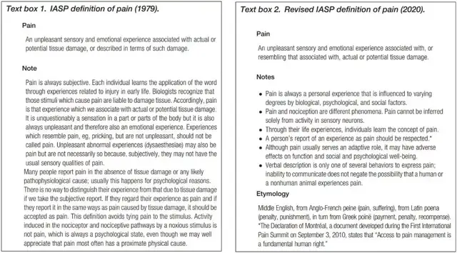 2020年7月16日,IASP对“疼痛”(Pain) 定义进行了修改,并在线发表在其会刊《PAIN》杂志上,这是IASP对自1979年开始在全世界使用的疼痛定义的首次修订。