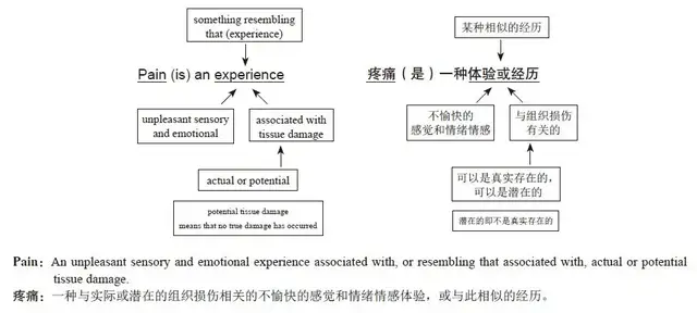 1979年,国际疼痛学会(The International Association for the Study of Pain, IASP) 在世界范围对疼痛进行了定义。《中国疼痛医学杂志》的翻译:疼痛是一种与实际或潜在的组织损伤相关的不愉快的感觉和情绪情感体验,或与此相似的经历。