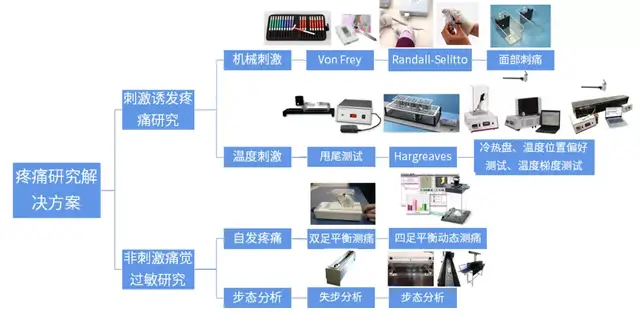 伤害感受性疼痛是由于刺激组织损伤的疼痛感受器(伤害感受器)造成,这些感受器主要位于皮肤或内脏。引起伤害性疼痛的伤害有切割伤、挫伤、骨折、挤压伤、灼伤、或其它任何可损害组织的伤害。该类疼痛常规会采用机械疼痛检测设备(如Von Frey,Randall-Selitto、面部刺痛温度刺痛),温度测痛设备(如:冷热盘、温度位置偏好测试、温度梯度测试、热痛甩尾、Hargreaves)等设备。