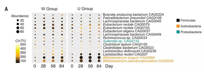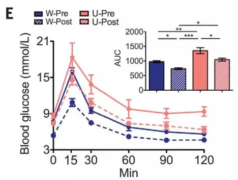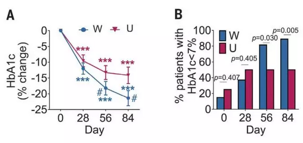 ▲相较对照组(U),高膳食纤维组(W)能更好地降低糖化血红蛋白水平(图片来源:《科学》)