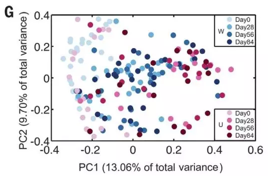 ▲不到 3 个月的治疗,就让高膳食纤维组(蓝色)与对照组(红色)的肠道菌群结构出现了明显变化(图片来源:《科学》)