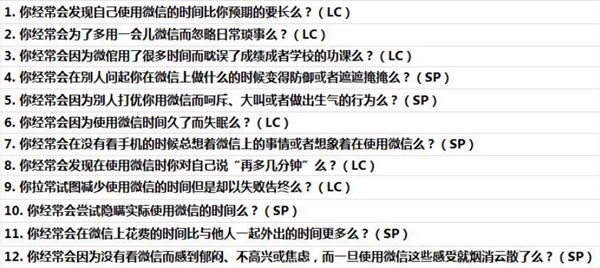 不久之前,《精神障碍诊断与统计手册》将互联网游戏障碍(IGD)列为一种潜在的精神障碍,进一步引发了有关互联网成瘾研究框架的讨论。互联网沟通障碍(ICD)——使用社交网络和信使平台成瘾——即包含在该框架内。微信是最受欢迎的手机通讯应用之一,过度使用微信可能扰乱日常生活,并产生上瘾行为。为了更好地表征通讯应用的潜在上瘾性,电子科技大学的Christian Montag、Benjamin Becker及同事调查了微信沉迷水平与额叶纹状体边缘区域的结构变化之间的关联。作者评估了61位被试的磁共振成像数据,并收集了他们自我描述的微信使用频率信息。结果发现微信沉迷倾向与大脑亚属前扣带皮层中灰质容量较小相关(亚属前扣带皮层是监测和调控成瘾行为背后神经网络的关键脑区)。他们还发现微信支付功能使用频率较高与伏核较小相关。研究的大脑区域,以及灰质容量和微信成瘾分数和使用频率之间的联系。Montag et al.作者总结表示,成瘾症状水平较高或过度的使用行为与这些脑区内的某些物质容量减少之间的关系,与过去有关物质成瘾和行为成瘾(包括IGD)的研究发现相符。尽管如此,还需要开展进一步的研究来了解大脑功能层面可能发生的变化。以下12种情况你一共中了几条?LC:失控/时间管理;SP:渴求/社会问题