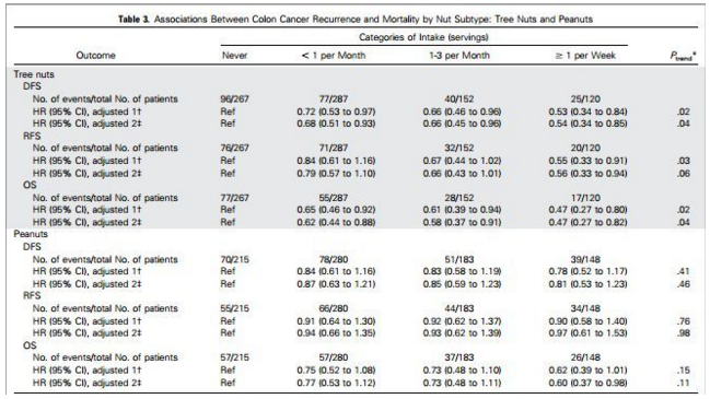 Temidayo Fadelu 医学博士关于坚果的神奇功效,去年 11 月份我们就有报道:(心血管顶级期刊:吃坚果,活得长!21 万人 20 年随访研究证实,每周吃五次坚果可降低冠心病风险丨临床大发现),在降低冠心病风险的同时,它还能显著降低 2 型糖尿病和代谢综合症的风险 [2]。然而,这样一个具有天然药性的食物是如何与结肠癌患者联系起来的呢?研究人员查阅以往文献发现,能量过剩(如 2 型糖尿病、肥胖等)、高糖饮食与结肠癌患者复发风险增加有关 [3],而坚果的摄入却能降低 2 型糖尿病和代谢综合征的风险[4]。于是他们猜测,坚果可能会对结肠癌患者有益。为验证这一想法是否成立,他们在 1999 年 4 月至 2001 年 5 月开展了一项大型前瞻性临床试验,并使用食物频率问卷(food frequency questionnaire,FFQ)记录了 826 例结肠癌患者术后、术后 4 个月(辅助治疗开始)和 14 个月(辅助治疗后 6 个月)的饮食和生活习惯。同时,在辅助治疗后 6 个月,使用聚合酶链反应(PCR)和焦磷酸测序检测 KRAS、BRAF、PIK3CA 和 TP53 突变,微卫星不稳定性和 PTGS2 的表达来评估肿瘤的复发。在中位时间为 6.5 年随访并控制了其他可能的混杂因素(西方饮食模式、吸烟和饮酒)后,研究人员发现,坚果摄入增加与结肠癌复发和死亡率显著减少有关,与未食用坚果的结肠癌患者相比,每周食用两份或两份以上(28g/ 份)坚果的患者,其无病生存期提高了 42%,总生存期提高了 57%。