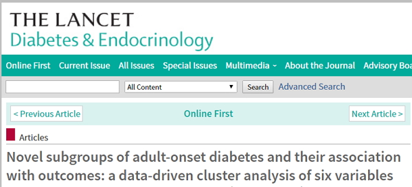 而发表在The Lancet Diabetes and Endocrinology上题为“Novel subgroups of adult-onset diabetes and their association with outcomes: a data-driven cluster analysis of six variables”研究通过对14,775名患者进行调查发现,这些糖尿病患者可以分成5个不同的组: