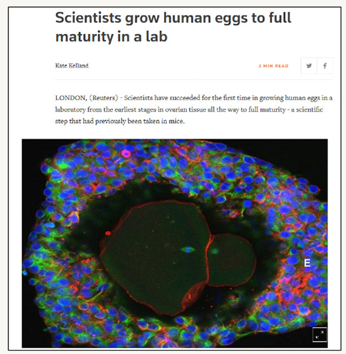 人类卵子成熟不再单纯依靠女性本体。日前,《分子人类生殖》(Molecular Human Reproduction)在线发表了爱丁堡大学生殖生物学家Evelyn Telfer及其同事的一项最新成果:首次在实验室内将人类卵子从早期阶段培育成熟。这意味着新的女性不孕症治疗方案或将出现。实际上,早在2008年,Telfer等人就开始着手此项研究。当时,他们将卵巢组织中的始基卵泡培养成半成熟状态。随后的2015年,美国西北大学接力完成了剩下的一半工作,他们将部分发育的早期卵泡培养成成熟的卵子。在最新的这项研究中,Telfer和合作者完成了整个培育周期。研究团队对10名女性经剖腹获取一小块卵巢组织标本,分离出87个始基卵泡,然后放入营养素培养基中培养。接下来,研究团队从始基卵泡中小心提取出脆弱的不成熟卵子和一些周围细胞,让它们在一块富有更多支持生长的蛋白质的特殊培养基膜上进一步成熟。最后,只有9枚卵子通过了最终的成熟测试——它们能够分裂、染色体减半,可以准备好在受精过程中和精子结合。美国匹兹堡大学麻吉妇女研究所干细胞生物学家Kyle Orwig未参与上述研究,他评价,“这项成果是非常重要的,它在应用方面有很大的潜力,我们已经有这方面的患者。”