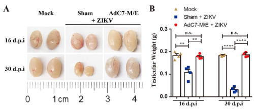 图2.AdC7-M/E疫苗保护睾丸免受寨卡病毒引起的损伤和萎缩