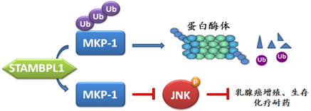 丝裂酶原活化蛋白磷酸酶MKP-1在乳腺癌中存在高表达现象,并主要通过调控丝裂原活化蛋白激酶在乳腺癌进展中发挥重要作用,但其维持高表达的机制并不清楚。临床样本及数据库分析结果提示,在乳腺癌患者样本中STAMBPL1和MKP-1表达水平显著正相关。机制研究发现,STAMBPL1并不显著影响MKP-1的转录表达,而是通过与MKP-1蛋白相互作用,下调MKP-1泛素化水平,抑制MKP-1泛素化降解从而稳定其蛋白表达。进一步的机制探索显示,STAMBPL1/MKP-1过表达会抑制c-Jun氨基末端激酶(JNK)磷酸化和活性,从而抑制化疗药物顺铂引起的细胞凋亡和生存。总的来说,该研究表明STAMBPL1通过去泛素化调控MKP-1稳定其蛋白表达,进而抑制JNK凋亡信号通路活化,导致对化疗药物耐药;STAMBPL1-MKP-1-JNK信号通路为乳腺癌耐药的治疗提供了潜在的临床诊治靶点。