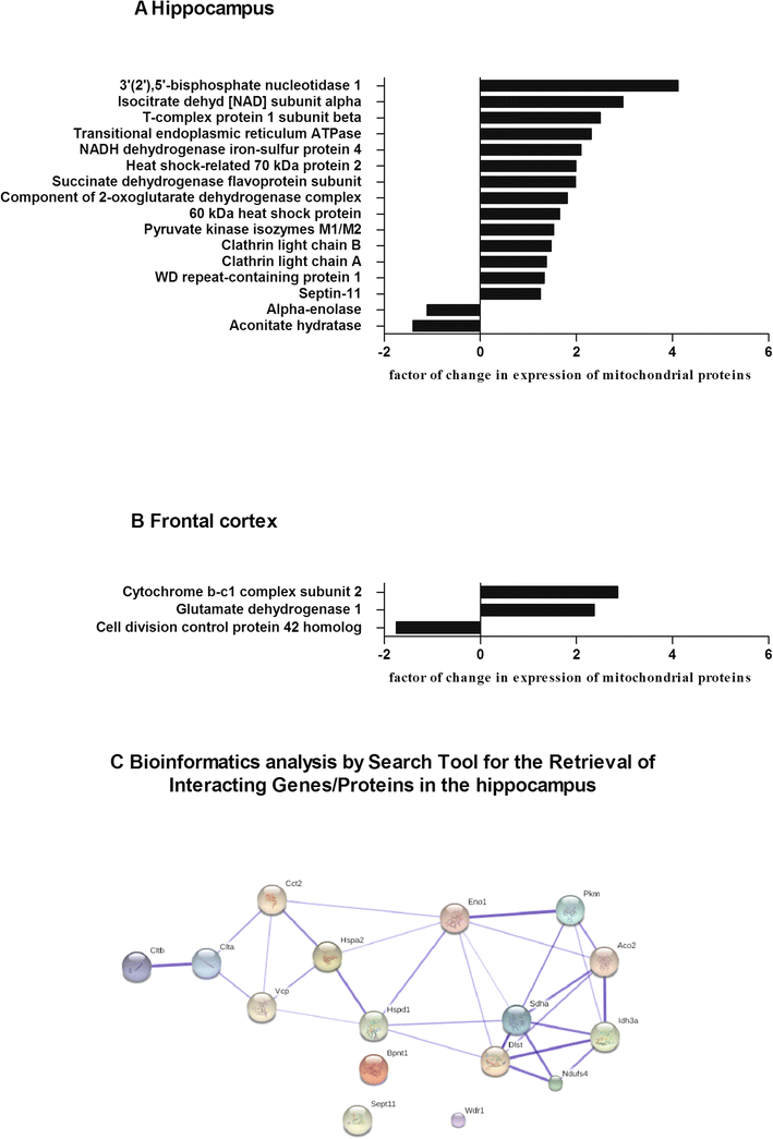 摘要:越来越多的证据集中在线粒体紊乱对抑郁症发展的影响上,但是关于抗抑郁药长期服用对大脑线粒体蛋白谱的影响的数据却很少。本研究的目的是探讨一种非典型抗抑郁药噻奈普汀对线粒体的影响。基于高架十字迷宫和强迫游泳试验,大鼠暴露于产前应激程序显示抑郁和焦虑样。慢性噻奈普汀给药后,双向电泳结合质谱显示产前应激大鼠大脑结构的变化。2-酮戊二酸、琥珀酸脱氢酶黄素蛋白亚基,异柠檬酸α亚基,在海马中的表达上调。在额叶皮质,在谷氨酸脱氢酶和细胞色素bc1复合体亚基2的表达显著增加。这些研究结果表明,线粒体是治疗干预的目标,线粒体功能可能是有效治疗应激相关疾病的关键。关键词:噻奈普汀 产前应激 线粒体 海马 额叶皮质简介:公认的抑郁症理论是基于单胺类传输理论,免疫系统功能紊乱,神经营养因子功能弱化,下丘脑-垂体-肾上腺轴运动亢进。最近,另一个有趣的理论被称为“线粒体功能障碍假说”。线粒体功能受损,导致能量故障,减少三磷酸腺苷(ATP)的生产,影响钙平衡,自由基的产生和氧化应激增强,导致细胞凋亡过程的开始。此外,中枢神经系统(CNS)线粒体可能控制神经可塑性过程,包括神经分化、轴突、树突重塑和神经递质的释放。一些数据还表明线粒体功能与表观遗传过程相互作用,这些过程在神经精神疾病的发病过程中起重要作用,包括抑郁症状。所有这些观察表明线粒体功能障碍可能是导致抑郁症的代谢紊乱的一个关键因素。抑郁症能观察到以下现象:线粒体形态的改变,线粒体呼吸的减少,线粒体DNA多态性和线粒体DNA突变水平的增加以及核基因和参与线粒体呼吸的蛋白质的下调。此外,电子显微镜数据显示线粒体的数量及其在脑区的分布在这些疾病的发病机制中起着重要的作用。抑郁症患者大脑中高能量磷酸盐含量的降低和pH值的降低通常能被观察到。因此,线粒体可能是治疗干预的一个有趣的靶点。线粒体功能的改善可能是有效治疗压力相关疾病的一个重要组成部分。噻奈普汀,非典型抗抑郁药,抗抑郁药中似乎是最有趣的和有前途的;然而,噻奈普汀作用的分子机制仍有争议。经典的三环类抗抑郁药和选择性5-羟色胺再摄取抑制剂(SSRI)阻断5-羟色胺再摄取,噻奈普汀是有选择性地提高血清素摄取进入大鼠脑突触体。噻奈普汀可能对谷氨酸系统有影响,逆转应力相关受损神经的可塑性。此外,噻奈普汀抗惊厥和镇痛作用已被假定。到目前为止,只有少数研究噻奈普汀对线粒体的影响。噻奈普汀抑制体外复合体I活性,但其他线粒体复合体、凋亡过程和膜电位减少不受这种药物的影响。母爱剥夺大鼠慢性噻奈普汀的使用造成杏仁核和海马的肌酐浓度和调制线粒体复合物I和呼吸链复合体II/III水平的减少。据我们所知,目前没有关于噻奈普汀对慢性抑郁症的动物模型脑线粒体蛋白表达的影响研究。抑郁症的线粒体病理可能是由于其他原因,早期不良生活经历影响大脑发育。因此,在本研究中,我们使用了一种很好的抑郁症动物模型,即产前应激程序。在这个模型中,观察到了免疫系统和神经内分泌系统的行为紊乱和异常。在本研究中,我们采用双向电泳结合质谱技术研究非典型抗抑郁药噻奈普汀慢性给药对受产前应激影响的大脑区域,即3月龄大鼠雄性大鼠的海马和额叶皮质线粒体蛋白质表达谱的影响。动物:SD大鼠(200-250g)饲喂在标准实验室条件下,每天对雌性大鼠进行阴道涂片,以确定发情周期的阶段。在发情前期,雌性鼠同雄性鼠合笼12 h。第二天早上,阴道涂片中发现了精子。怀孕的雌性动物随机分为对照组和应激组(每组n = 8 )。应激程序:产前应激过程按先前描述的进行。简单地说,应激组怀孕的雌鼠从怀孕的第十四天开始每天进行三次应激,一直持续到分娩。在上午9点,下午12点,下午5点,老鼠被放置在塑料缸(7/12厘米)和暴露于明亮的光(150 W)为45分钟。对照组怀孕的母鼠在笼子里没有受到打扰。在研究中,只有八到十只幼鼠后代,雄性和雌性数量相同。从21日龄窝中筛选出雄性后代。每只笼中有四只动物(每窝一只到两只)。在3个月龄的时候,对照组和应激组的母鼠的后代进行了第一次行为验证。高架迷宫测试:高架十字迷宫试验,是根据Pellow先前描述的方法对控制组和产前应激组大鼠进行(每组18只)。迷宫被提升到离地面50厘米的高度,只有微弱的照亮灯光。试验前,这些动物被放置在实验室1小时。每只动物被放置在迷宫的中心区域,面对封闭的手臂,观察总共5分钟。结果显示为进入迷宫开放臂和闭合臂的平均数目和每一个迷宫的平均时间。强迫游泳实验:为进一步验证抑郁症动物模型,采用先前描述的方法进行强迫游泳试验。简而言之,动物(n = 18 每组)分别进行试验,在这期间他们被迫在一个装满水的缸里35厘米的高度游泳(25°C)。第一次和第二次试验之间有24小时的间隔。第一次试验持续了15分钟,第二次试验持续了5分钟。对抑郁症动物模型的药理验证,在慢性抗抑郁药物治疗的最后几天,动物再次接受高架迷宫和强迫游泳训练。抗抑郁药:行为验证后,控制和产前应激组后代分为六个实验组(对照 + 赋形剂组,对照 + IMI组,对照 + TIA组,应激 + 赋形剂组,应激 + IMI组、应激 + TIA组;每组六只),用抗抑郁药或赋形剂治疗21天。丙咪嗪(作为比较噻奈普汀效率行为测试的参考药物),噻奈普汀,0.9%生理盐水、腹腔注射,