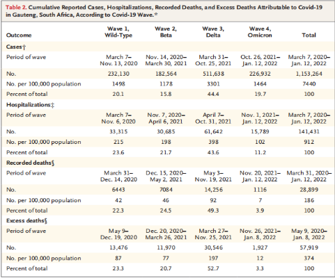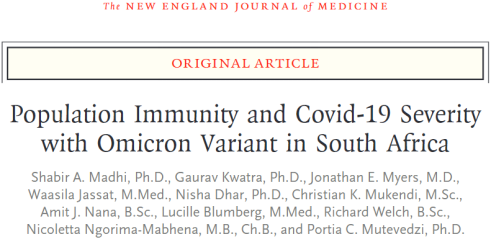 [2] Madhi SA, Kwatra G, Myers JE, et al. Population Immunity and Covid-19 Severity with Omicron Variant in South Africa. N Engl J Med. 2022 Apr 7;386(14):1314-1326. doi: 10.1056/NEJMoa2119658. Epub 2022 Feb 23. PMID: 35196424; PMCID: PMC8908853.