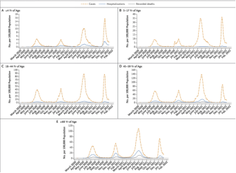 图2 按年龄组划分的Covid-19病例、住院人数、记录死亡人数和超额死亡人数 (图源:[2])
