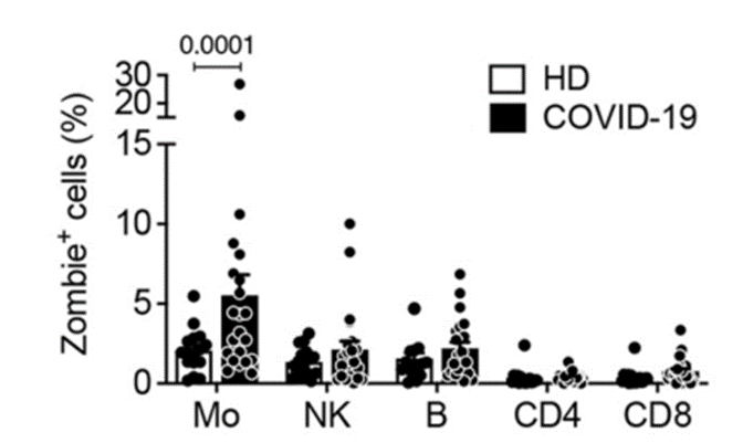 研究人员将新冠患者新鲜的血液样本与健康人的血液样本进行分析对比(图2),结果显示:在新冠患者的血液中,大约有6%的单核细胞在经历着焦亡(Pyroptosis),又称为炎性坏死,焦亡的细胞不断胀大,直至细胞膜破裂,释放细胞因子和趋化因子等。