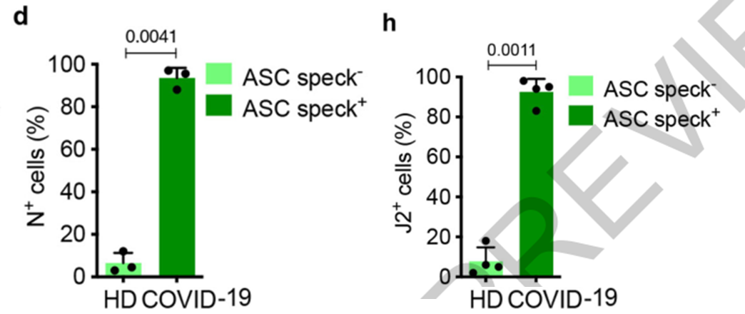 那么是什么原因导致新冠患者体内的单核/巨噬细胞出现焦亡呢?接下来,令人惊讶的事出现了,研究人员在这些焦亡的单核细胞和巨噬细胞中找到了新冠病毒感染的迹象——大约有10%的单核细胞及8%的肺巨噬细胞中存在新冠病毒的核蛋白壳及双链RNA。说明新冠病毒不仅进入到了细胞内部,还试图进行复制,而这些被感染的单核细胞及巨噬细胞无一例外都发生炎症小体激活,并走向焦亡,说明新冠病毒的直接感染是单核/巨噬细胞焦亡的直接原因(图3)!