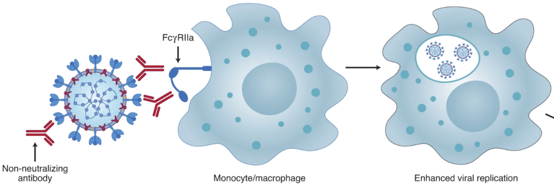 也就是说,新冠抗体不仅不能起到保护作用,反而会促进新冠病毒感染单核细胞和肺巨噬细胞,引起这些细胞发生焦亡,兴起炎症风暴,这令人联想到抗体依赖的感染增强效应(Antibody-dependent enhancement,简称 ADE 效应)。ADE效应是指人体通过感染、免疫接种或被动输入等方式使机体对某种病原体产生抗体后,这些抗体协助病毒进入靶细胞,提高感染率,引起病情加重的现象。