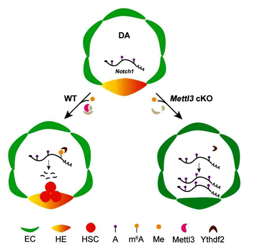 m6A修饰调控哺乳动物造血干细胞发育模式图血液,犹如生命的“河流”,静静地在生物体内流淌,哺育着每一个“细胞”。然而,成体血液的再生与再造,一直是临床恶性血液疾病治疗过程中难以攻克的瓶颈。作为脊椎动物血液的源泉,具有自我更新和多系分化潜能的造血干细胞的体外诱导和扩增,一直是组织器官再造的前沿课题,更是众多恶性血液疾病患者的希望。由于对血液发生复杂调控网络了解的局限性,目前尚未建立成功可行的方案。脊椎动物的造血过程分为两个阶段:初级造血和次级造血。其中,造血干细胞产生于次级造血过程。在胚胎期的主动脉 - 性腺 - 中肾(AGM)区域,造血干细胞由特化的生血内皮细胞通过内皮 - 造血转化过程产生,随后迁移至胎肝(人和小鼠)或者尾部造血组织(斑马鱼)进行扩增和分化,部分前体细胞迁移至胸腺,分化成淋巴细胞。最后,造血干细胞迁移至骨髓(人和小鼠)或者肾髓(斑马鱼)维持机体终身造血过程。迄今为止,在造血干细胞产生及分化过程中,已发现诸多信号通路和转录因子具有关键的调控作用。然而,对于表观遗传修饰,尤其是 RNA 甲基化,调控血液发生的研究却极其有限。此前,中国科学院动物研究所刘峰实验室与中科院北京基因组研究所杨运桂实验室合作,发现 mRNA 的 m6A 修饰调控斑马鱼造血干细胞的命运决定。在此基础上,刘峰实验室与中科院院士周琪、李伟实验室、杨运桂实验室继续合作,利用条件性敲除系统,进一步揭示 m6A 在小鼠造血干细胞发育过程中的生物学功能,并深入探索其作用机制。首先,利用 Vec-Cre 在血管内皮细胞中特异性敲除 m6A 甲基转移酶复合体重要组分 Mettl3,发现血管内皮细胞中的 m6A 水平显著降低。系统的表型分析结果显示,在内皮细胞特异性敲除 Mettl3 的小鼠胚胎里,造血干细胞的命运决定受到影响,血管动脉内皮特性增强。但在血细胞中特异性敲除 Mettl3,并不影响造血干细胞的产生。其次,通过 RNA-seq 分析发现,在内皮细胞特异性敲除 Mettl3 的小鼠 AGM 组织中,Notch 信号通路被过度激活,其中,以 Notch1 为代表的动脉内皮相关基因的表达量显著上调。同时,m6A-RIP-qPCR 结果表明,Notch1mRNA 的 m6A 富集程度显著降低。上述结果说明,血管内皮细胞 m6A 修饰的缺失,影响了 Notch1 在造血干细胞命运决定过程中的动态平衡。此外,结合已报道的测序数据分析发现,m6A 修饰识别蛋白 Ythdf2 的结合区段与 Notch1mRNA 上发生 m6A 修饰的区段有重叠,这预示 m6A 修饰调控 Notch1 mRNA 可能是通过 Ythdf2 介导的。 该项工作进一步证明了 m6A 修饰在脊椎动物造血干细胞发育过程中的关键作用,不仅将前期在斑马鱼中发现的生物学规律推广到更高等的哺乳动物,也是对造血干细胞产生分子机制的完善与补充。同时,该成果将为血液器官再造提供理论支持,并推动体外诱导产生造血干细胞这一科学前沿的发展。相关研究成果以 Endothelial-specific m6A modulates mouse hematopoietic stem and progenitor cell development via Notch signaling 为题,在线发表在 Cell Research 上。研究工作得到了中科院干细胞与再生医学战略性先导科技专项、国家杰出青年科学基金、国家自然科学基金重点项目以及国家重点基础研究发展计划的资助。https://www.nature.com/articles/cr2017143 动物所等揭示m6A修饰调控哺乳动物造血干细胞发育的机制