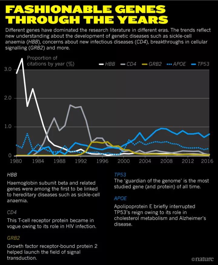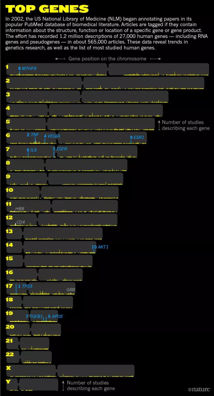 但除了 TP53 之外,还有些上榜基因并非人人都耳熟能详,它们有些曾领风骚一时,但逐渐被冷落。“这张榜单很出人意料,”现已是哈佛大学(Harvard University)医学院博士后,钻研基因组数据可视化课题的 Kerpedjiev 说:“有些上榜基因是预料之中的,有些完全在意料之外。”因此,《自然》杂志社与 Kerpedjiev 合作,发布了这个“十大最热门基因”的榜单,旨在回顾生物医学研究的趋势,揭示公共卫生和特定疾病的兴趣如何对科研产生影响。榜单也显示了生物医学的研究重心是如何集中在几个特定领域中:人类基因组总共包含两万个左右能编码蛋白质的基因,而在 NLM 搜录的内容中,有近四分之一的论文只覆盖了 100 个左右的基因,其余成千上万的基因都被忽略了。