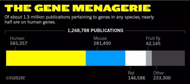 ▲热门基因的物种分布:人类 > 小鼠 > 大鼠 > 果蝇(图片来源:《自然》)