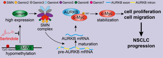 2022年4月22日,陈勇彬课题组在《Clinical and Translational Medicine》杂志在线发表了题为“Gemin6 promotes c-Myc stabilization and non-small cell lung cancer progression via accelerating AURKB mRNA maturation”的研究论文。以往的研究表明,癌基因c-Myc在多种类型的人类癌症中表达升高,因此深入解析c-Myc如何促进肿瘤恶性进展的分子机制,对于研发新的肿瘤治疗策略至关重要。 近期陈勇彬课题组研究发现,参与调控核糖核蛋白复合物(RNPs)形成的SMN complex(survival motor neuron SMN)的组分之一:Gemin6,在非小细胞肺癌(NSCLC)的肿瘤组织和细胞系中高表达,且Gemin6高表达的NSCLC患者临床表现更差。经研究发现,Gemin6启动子区域的低甲基化水平导致其在NSCLC中高表达,而敲低Gemin6表达可以显著抑制肿瘤细胞的增殖、迁移能力和异种移植瘤的形成。课题组利用FDA批准的药物文库筛选靶向Gemin6的抗肿瘤药物,发现舍吲哚(Sertindole)可以特异性下调Gemin6表达并抑制肿瘤生长。分子机制研究发现,Gemin6促进了AURKB mRNA的剪切成熟过程和蛋白质表达,进而上调了c-Myc的磷酸化修饰和蛋白稳定性,由此通过c-Myc相关通路促进了 NSCLC 的恶性进展。该研究结果揭示了Gemin6在NSCLC中的致癌作用,并挖掘了舍吲哚在NSCLC治疗中的临床转化应用前景。