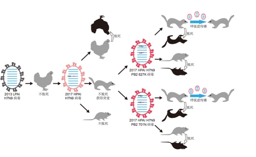 原文链接:H7N9 virulent mutants detected in chickens in China pose an increased threat to humans原文摘要:Certain low pathogenic avian influenza viruses can mutate to highly pathogenic viruses when they circulate in domestic poultry, at which point they can cause devastating poultry diseases and severe economic damage. The H7N9 influenza viruses that emerged in 2013 in China had caused severe human infections and deaths. However, these viruses were nonlethal in poultry. It is unknown whether the H7N9 viruses can acquire additional mutations during their circulation in nature and become lethal to poultry and more dangerous for humans. Here, we evaluated the evolution of H7N9 viruses isolated from avian species between 2013 and 2017 in China and found 23 different genotypes, 7 of which were detected only in ducks and were genetically distinct from the other 16 genotypes that evolved from the 2013 H7N9 viruses. importantly, some H7N9 viruses obtained an insertion of four amino acids in their hemagglutinin (HA) cleavage site and were lethal in chickens. The index strain was not lethal in mice or ferrets, but readily obtained the 627K or 701N mutation in its PB2 segment upon replication in ferrets, causing it to become highly lethal in mice and ferrets and to be transmitted efficiently in ferrets by respiratory droplet. H7N9 viruses bearing the HA insertion and PB2 627K mutation have been detected in humans in China. Our study indicates that the new H7N9 mutants are lethal to chickens and pose an increased threat to human health, and thus highlights the need to control and eradicate the H7N9 viruses to prevent a possible pandemic.