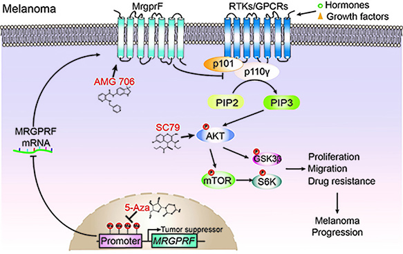 2022年5月4日,中国科学院昆明动物研究所陈勇彬课题组在《Signal Transduction and Targeted Therapy》杂志在线发表了题为“MrgprF acts as a tumor suppressor in cutaneous melanoma by restraining PI3K/Akt signaling”的研究论文。在抗肿瘤新药研发过程中,定位在细胞膜上的肿瘤新生物标志物,往往是最好的选择。陈勇彬课题组研究发现,由于启动子区域的高度甲基化,与MAS相关的GPR家族成员:MrgprF在皮肤黑色素瘤(CM)的肿瘤组织和细胞系中的表达水平显著降低,并证实MrgprF表达水平较低的CM患者临床预后更差。进一步研究发现,MrgprF过表达可以有效抑制肿瘤细胞的增殖、迁移、裸鼠移植瘤体内生长和转移等能力。相反,敲除MrgprF可促进肿瘤细胞的增殖,以及HaCaT(正常人角质形成细胞)细胞的恶性转化,提示MrgprF在CM中发挥抑癌基因的功能。分子机制研究发现,MrgprF可通过蛋白互作方式阻断p101和p110g形成PI3K蛋白复合物,抑制PIP3的形成进而下调PI3K/Akt信号通路的活性,而Akt特异性的激动剂SC79可以逆转MrgprF的抑制功能,提示MrgprF未来可以被作为皮肤黑色素瘤治疗的新靶点。除此之外,课题组还利用小分子药物文库进行靶向药物的筛选,发现临床上常规用来抑制血管内皮生长因子受体蛋白(VEGFRs)活性的药物AMG 706,可以通过上调MrgprF的表达,进而抑制皮肤黑色素瘤细胞的生长和转移,为未来皮肤黑色素瘤的临床治疗提供了新的候选药物。