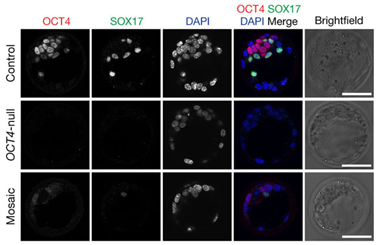 图片来自Nature, doi:10.1038/nature24033在一项新的研究中,来自英国和韩国的研究人员利用基因组编辑技术CRISPR/Cas9揭示出一种关键的基因在人胚胎的最初几天发育中发挥的作用。这是基因组编辑技术首次被用来研究人胚胎中的基因功能,这可能有助人们更好地理解我们的早期发育的生物学特征。相关研究结果于2017年9月20日在线发表在Nature期刊上,论文标题为“Genome editing reveals a role for OCT4 in human embryogenesis”。这些研究人员利用CRISPR/Cas9阻止一种关键的基因表达蛋白OCT4。在正常情形下,该基因在人胚胎的最初几天发育中是有活性的。在卵子受精后,它一直进行分裂,大约7天后,它形成一种有大约200个细胞组成的球体,即囊胚(blastocyst)。这项研究发现人胚胎需要OCT4来正确地形成囊胚。论文第一作者、英国弗朗西斯-克里克研究所的Norah Fogarty博士说,“我们吃惊地观察到这个基因在人胚胎发育中发挥着如此至关重要的作用,但是我们需要继续开展研究来证实它的作用。其他的研究方法,包括利用小鼠开展的研究,已提示着OCT4在胚胎发育更晚的时候发挥着一种更加专注的作用,因此我们的研究结果强调了开展人胚胎研究的必要性。”论文通信作者、弗朗西斯-克里克研究所的Kathy Niakan博士补充道,“发现一种基因在发育中的胚胎内发挥什么作用的方法之一是观察当它不发挥功能时会发生什么。如今,我们展示了一种高效地做到这一点的方法,我们希望其他的科学家们将利用它发现其他基因的作用。如果我们了解到胚胎成功地发育所需的关键基因,那么我们就可能改进体外受精治疗和理解妊娠失败的一些原因。要实现这样的理解可能需要多年的时间,我们的研究只是第一步。”这些研究人员在开始研究人胚胎之前,以小鼠胚胎和人胚胎干细胞为研究对象,花了一年多的时间来优化他们的技术。为了让OCT4失活,他们利用CRISPR/Cas9改变41个人胚胎中的DNA。7天之后,这些胚胎的发育停止了,他们随后分析了它们。除了在人胚胎中之外,OCT4被认为在干细胞生物学中也发挥着重要的作用。多能性干细胞能够变成任何一种其他类型的细胞,而且它们能够从胚胎中获得(如胚胎干细胞),或者让皮肤细胞等成体细胞经过重编程而被诱导出来(如诱导性多能干细胞)。人胚胎干细胞是从发育中的人胚胎内的具有较高的OCT水平的那一部分获得的。论文共同作者、弗朗西斯-克里克研究所的James Turner博士解释道,“我们有产生和使用多能性干细胞的技术,这毫无疑问是一项巨大的成就,但是我们仍然并未充分理解这些细胞如何发挥作用。更多地了解不同的基因如何导致细胞产生和保持多能性,将有助我们更加可靠地产生和使用干细胞。” 利用CRISPR/Cas9揭示OCT4基因在人胚胎早期发育中发挥着关键作用